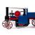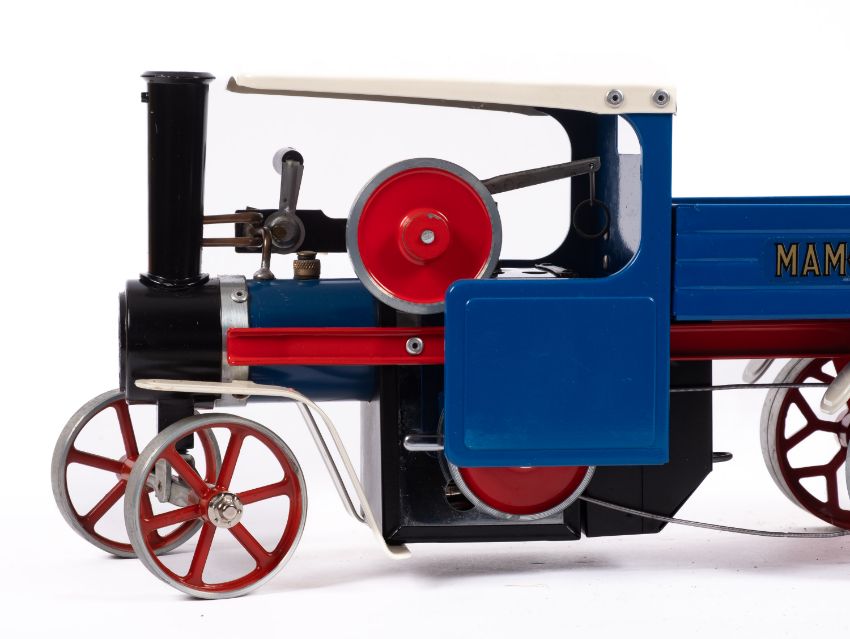 A Mamod live steam wagon. In blue with red trim and gold lettering, complete with burner pan and fuel, in original (damaged) box.
