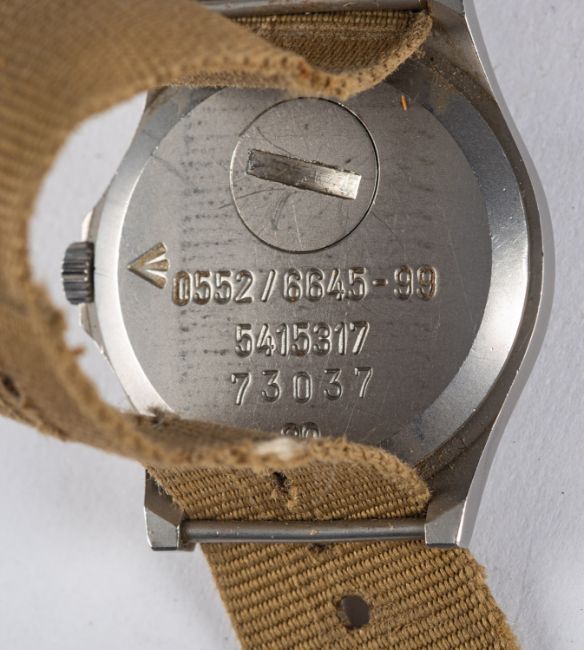CWC a quartz military issue wristwatch the round black dial having luminous Arabic numerals, triangular 12 o'clock marking, luminous baton hands, a sweep seconds hand and signed CWC, Quartz, T (For Tritium) the rear of the steel case stamped with a military arrow and numbered 0552/6645-99, 5415317, 73037, 90, with a green webbing strap, diameter 38mm.Note: 0552 refers to the watch being British Royal Navy issue; 6645 refers to this being a Nato issued time measuring instrument; 99 refers to this being a UK issue; 5415317 refers to the model; 73037 is the watch serial number; 90 refers to the year of manufacture being 1990.