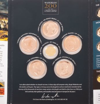 A London Mint Nelson five coin set, including three silver crowns, Alderney 22ct one pound, and Virgin Island $50 (22ct) with piece of Victory Hull, with Waterloo bronze medallion set.
