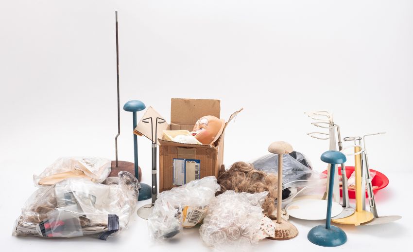 A collection of various doll parts. Comprising wax limbs, porcelain heads, wigs, stands and instructions, in three boxes.
