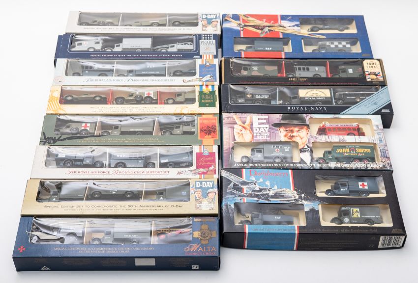 A collection of Lledo diecast military sets. A range of cars, trucks and tankers including British Army RAF and USA liveries etc, all boxed.