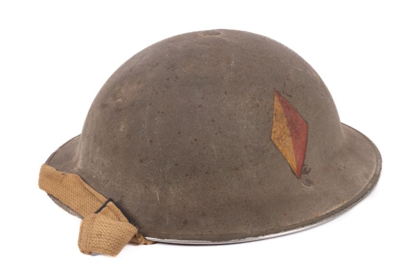 A British Mk1 steel helmet with Middlesex Regiment insignia. The steel helmet with canvas lining and strap, insignia painted to right side.
