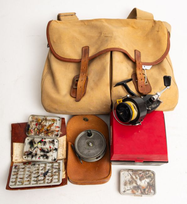 A JW Youngs 3' Condex fly fishing reel. In a leather pouch together with a Garcia Mitchell 300 reel, a collection of ties and fishing accessories, all within a Brady canvas fishing bag.