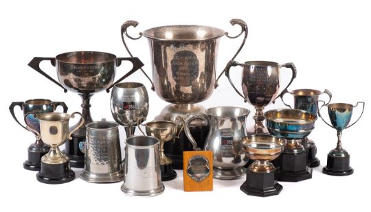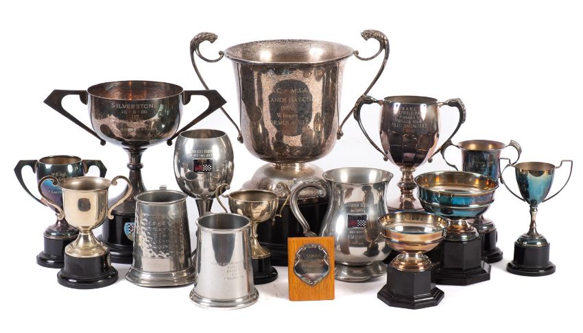A collection of 1969 Formula VEE racing trophies awarded to Fred Saunders. Comprising first place trophies from Silverstone, Brands Hatch, Cadwell Park, Lydden Hill, as well as second place trophies from Mallory Park, Lydden Hill and third place from Castle Combe plus others together with a photograph of Fred behind the wheel 40cm high x 50cm wide framed and glazed. Fred Saunders raced for his own team Mermaid Racing in the 1960s-1970s.He raced Formula VEE and 5000, as well as motorcycles. His main success came in 1969 driving a Crossle F15 with a Rover engine, Saunders won joint Champion of British Formula VEE for that season alongside Steve Matchett, with wins at Silverstone and Brands Hatch being particular highlights. In 1970 Fred stepped up to British and European Formula 5000 racing and took part in the Gold Cup at Oulton Park that year racing alongside Jackie Stewart, John Surtees, Jochan Rindt and Graham Hill. The 1970 season saw him finish 14th in the Championship with a highest finish of 5th at Brands Hatch. Fred continued until 1972 before selling the car to go deep sea diving. The car was raced by a number of racers through to the present day where it is being restored in Germany.