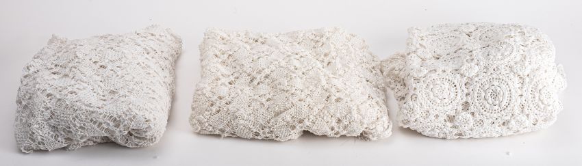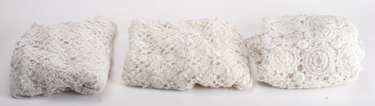 Three crocheted lace table covers. All of rectangular form and with foliate decoration, largest 150cm long, 85cm wide.