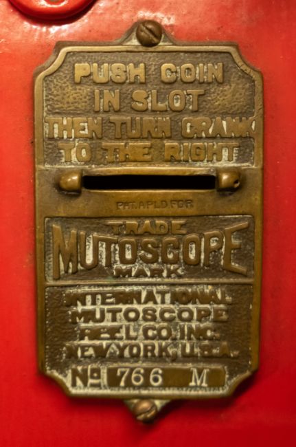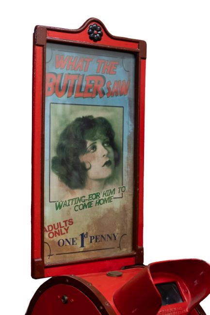 An early 20th century Mutoscope 'What The Butler Saw?' maker International Mutoscope Reel Co, New York, the rectangular glazed display with painted wooden title board over circular body with viewer signed as per title, brass instruction plate to coin slot numbered 'N.776M', with brass handle, painted in two tone red with black floral motifs, raised on a stand decorated en suite, 187cm high, 47cm wide at base, (together with keys and coins, working at time of cataloguing)
