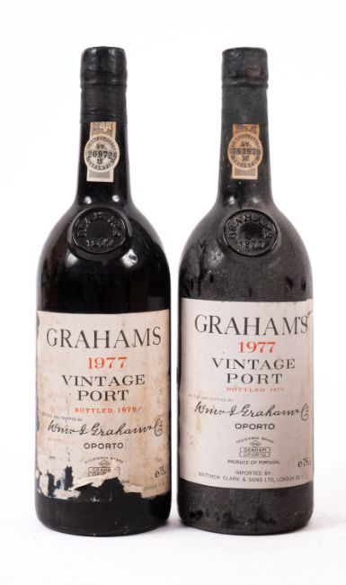 Two bottles of Grahams 1977 vintage port. One label damaged, 75cl, no vol shown.