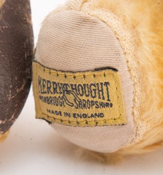 A 20th Century Merrythought teddy bear. Having blonde fur with celluloid eyes and cotton pads, makers tag to foot, 42cm tall, together with a similar teddy bear.