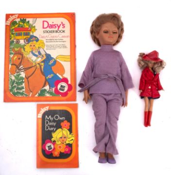 A Mary Quant Daisy Doll 'April Showers', in original costume (minus handbag) unboxed , together with 'My Own Daisy Diary' and 'Daisy's Gypsy Caravan' Sticker book, also an unboxed Palitoy 'Sheena' Growing hair doll