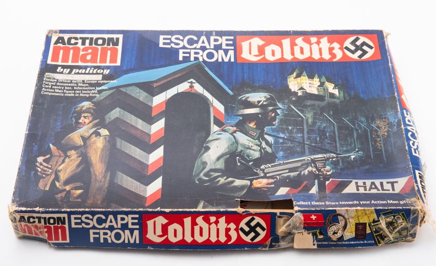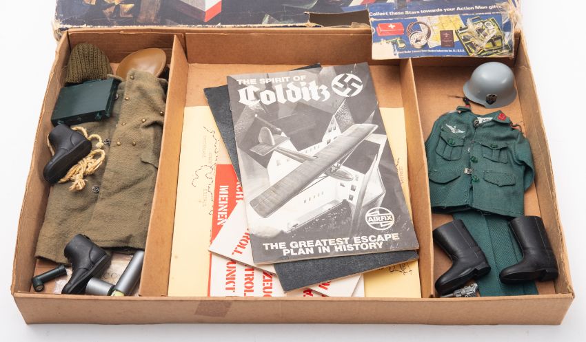 A Palitoy Action Man Escape From Colditz playset. Including uniform and documents etc, unchecked for completeness, in damaged box.