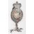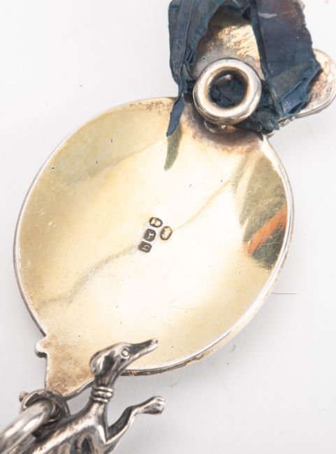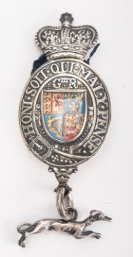 A George III silver gilt King's Messenger Badge, circa 1791, shaped oval form surmounted with a crown, with 'GIIIR' above a central painted Royal Coat of Arms under glass, inscribed 'Honi Soit .Qui . Mal .Y .Pense .' to border, over a ring suspension with a greyhound modelled in a running position 14cm high.