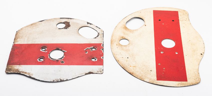 A 20th century British Railway enamel shunt signal disc. Of rounded form with red stripe on a white ground, together with a similar tin example. The largest 37cm high, 46cm wide (2).