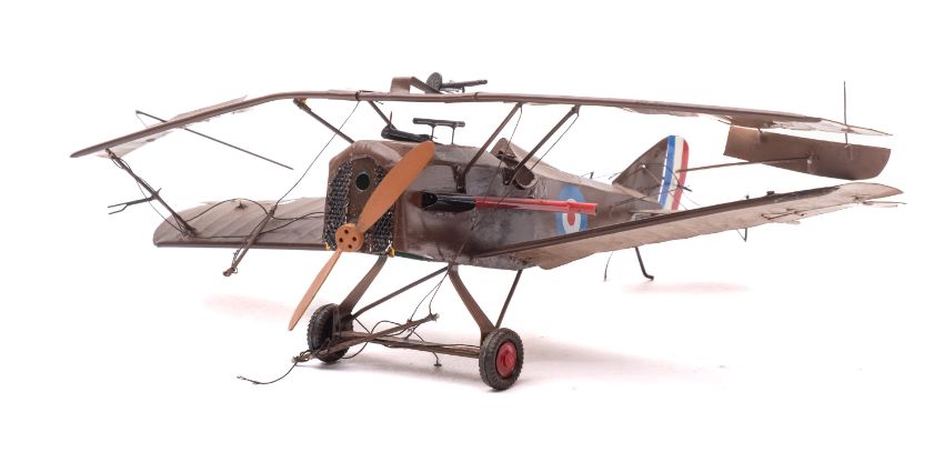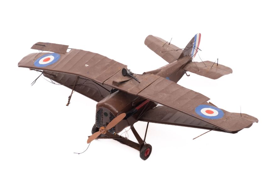 An early 20th century tinplate RFC bi-plane, brown with transfer roundals and black machine gun, 22.5cm long (playworn)