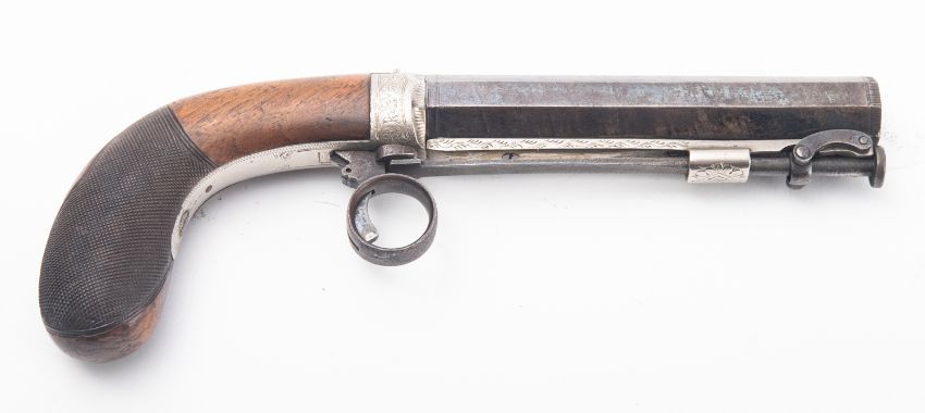 A 19th century Cooper's Patent underlever percussion cap pistol, the 5 1/4 inch blued octagonal barrel inscribed to top flat ' Presented By Tho's Westwood To Roland Beard; with stripped underlever spring, chased breech and tang with silvered fore end, ring trigger with safety on a chequered one piece bag grip inset vacant rectangular cartouche, 25cm long