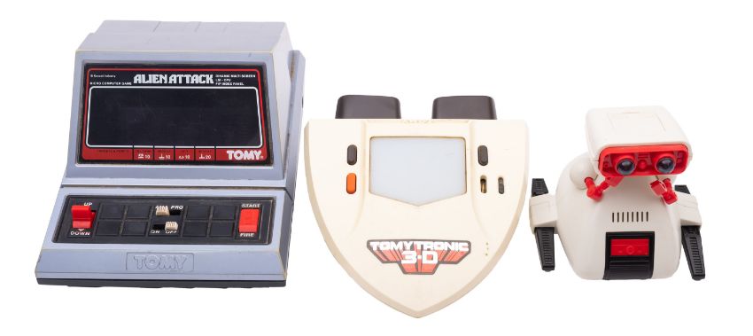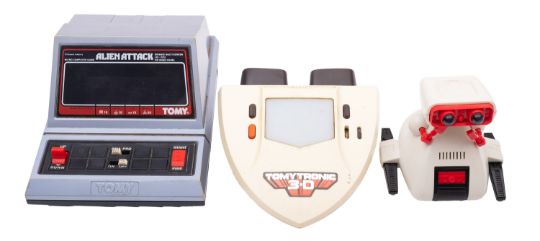 Three late 20th Century Tomy electronic toys. Comprising an alien Attack game, Tomytronic 3D and a powered robot toy.