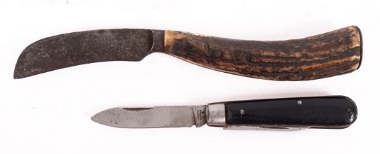 An early 20th Century Saynor Cooke & Ridal knife. Having a curved steel blade with horn handle, makers stamp to the blade, together with a Joseph Rodgers pocket knife. Please Note : Under UK legislation this will not be released without a photo ID and age verification check.