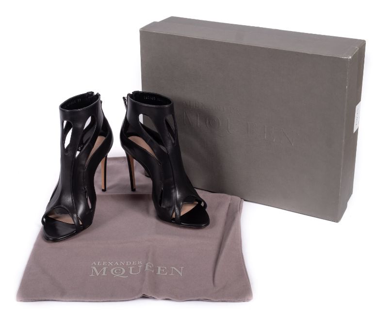 Alexander McQueen. A pair of Alexander McQueen black leather stilettos with a high cut out design, size 39, with original box and dust bag.