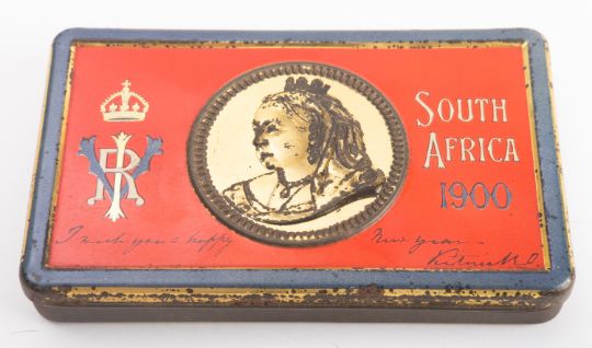 A Queen Victoria Boar War New Year 1900 Fry's Chocolate Tin containing original chocolate, together with a manuscript note dated 2nd Feb 1900 'Dear Mother. herewith my New Year's Present from Her Majesty the Queen...'
