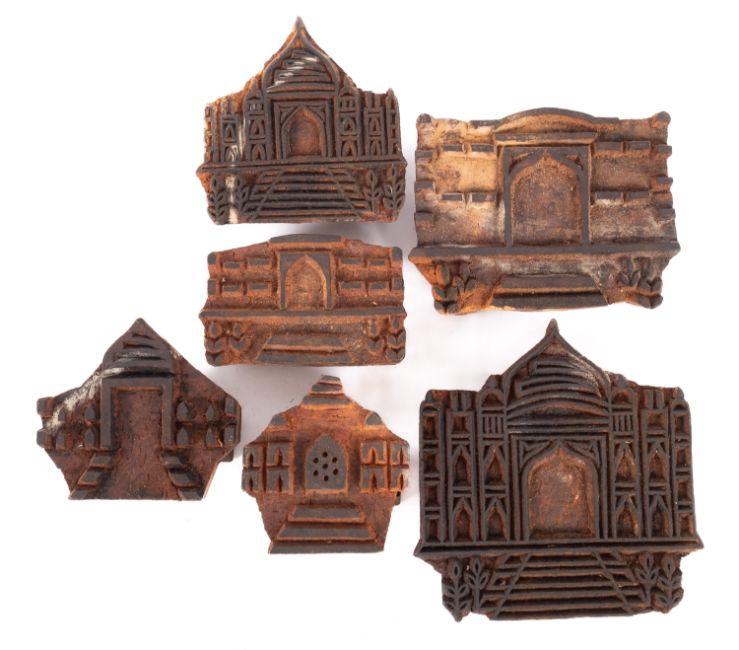 Six North West Indian carved wood printing blocks. Having various architectural scenes with floral decoration, largest 17cm square.
