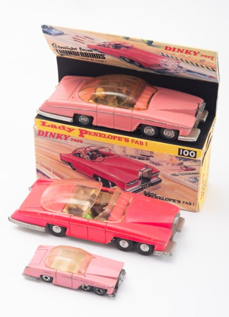 A Dinky diecast Lady Penelope's Fab 1. Number 100, in pink with retractable roof and suspension, the harpoons are missing but forward rocket present, in original box, together with a similar unboxed example missing harpoons and missile plus a smaller Matchbox version also unboxed.