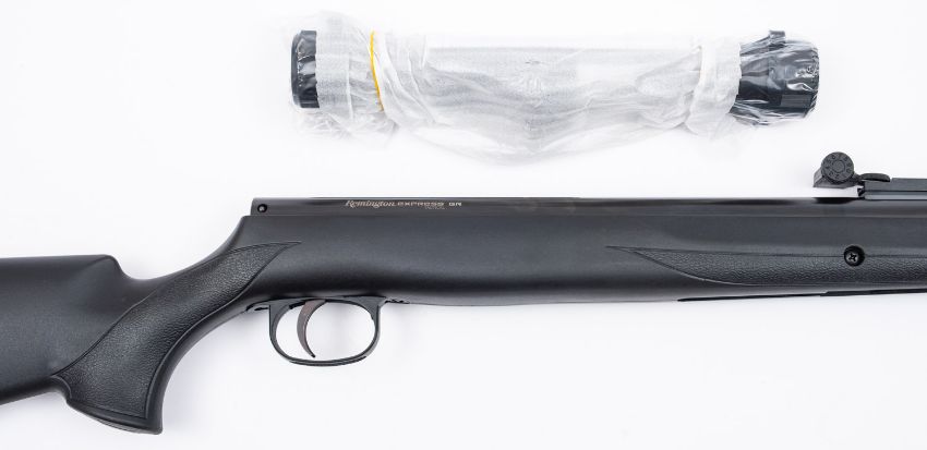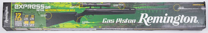 A Remington Express Tactical break barrel air rifle. No visible serial number, .177 calibre, having a 15' barrel on a composite stock with rubber butt plate and a 14.5' length of pull, together with scope, in original box.