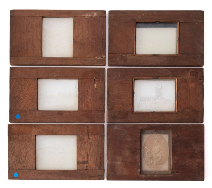 A collection of photographic magic lantern slides. In mahogany cases images include portraits and churches etc, maker unknown.