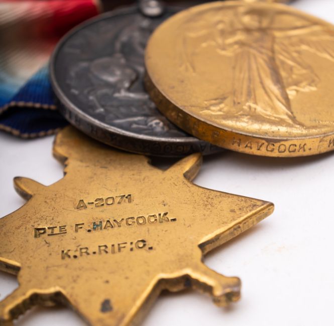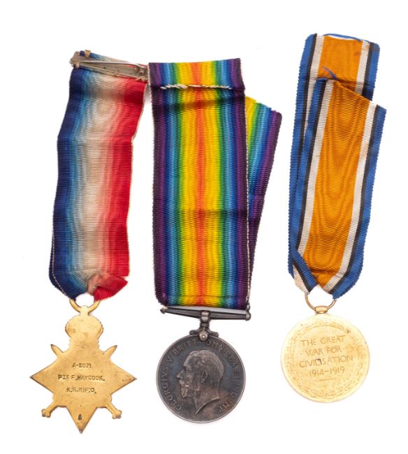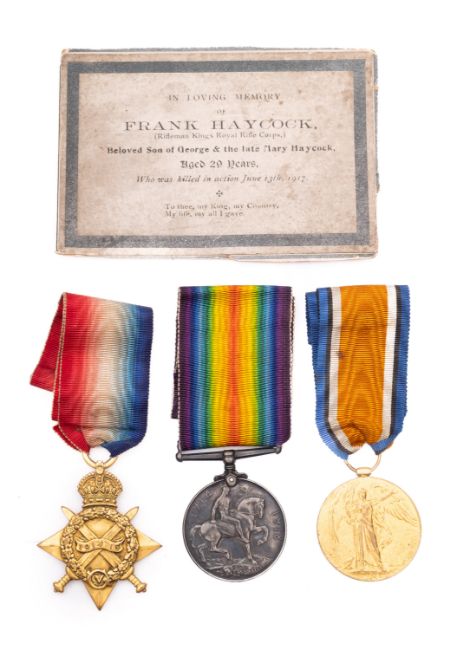 A WWI trio of medals awarded to A-2071 Pte F Haycock K.R.RIF:C. Comprising the 1914-15 star, War medal and Victory medal, together with In Loving Memory postcard.