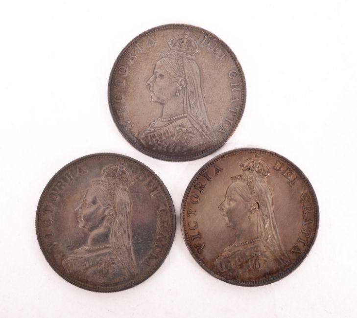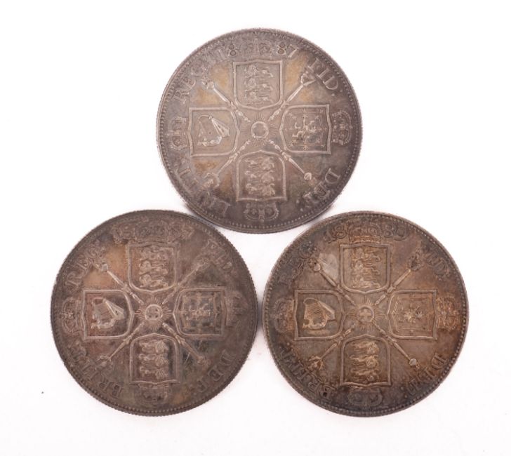 Two 1887 double Florin coins. Together with an 1889 example, higher grade.
