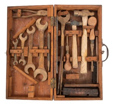 A WWII Air Ministry tool kit. Comprising a range of brass wrenches, hammers, a chisel and wire cutters etc, all stamped 'AM 1945', in original wooden fitted box.