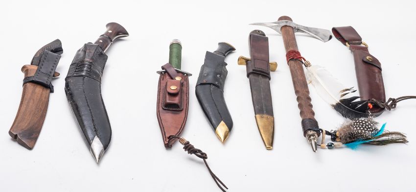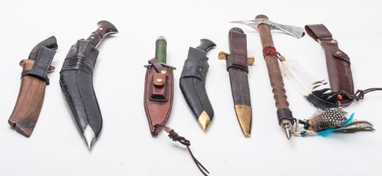 Two 20th Century Kukri knives. Together with a Tomohawk and a hunting knife with carved handle and wooden sheath, plus three other various knives. (7) Please Note : the Rambo knife has been removed from the lot                        Under UK legislation this will not be released without a photo ID and age verification check.