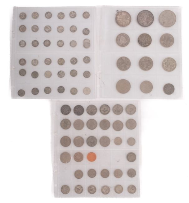 An 1889 Double Florin (mounted), a higher grade Edward VII 1902 Crown, an 1894 Half Crown, a George III Shilling, Silver Threepences, etc.
