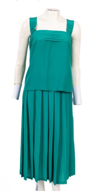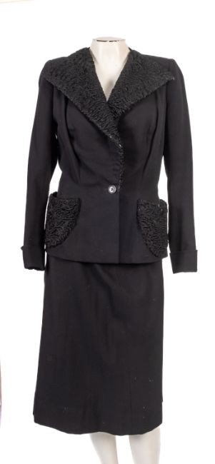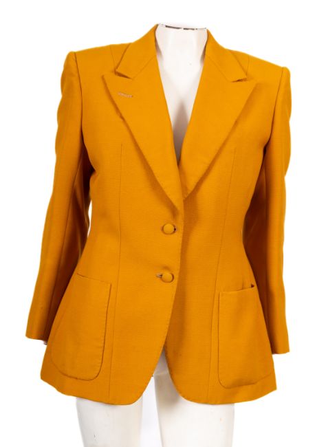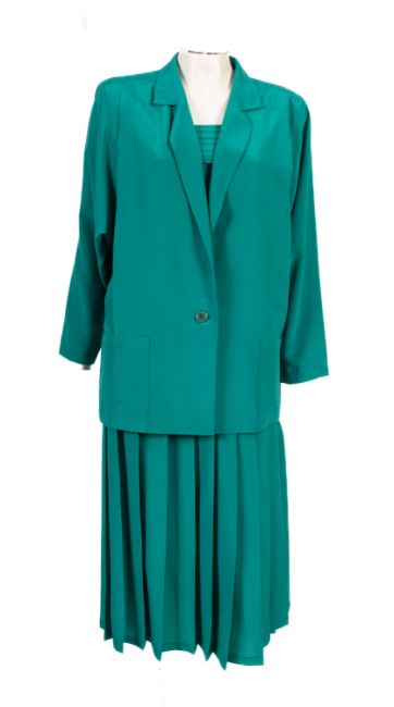 An emerald green 'Jean Caire' set with a skirt, jacket and vest top, size 38, together with a black matching suit jacket and skirt set, unlabeled, and an amber coloured suit jacket. (6)