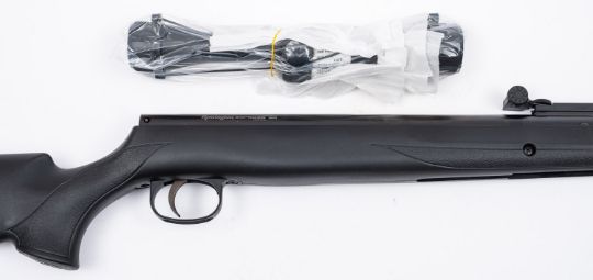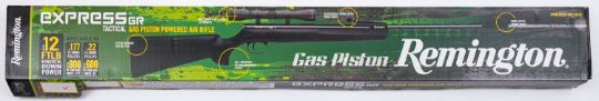 A Remington Express Tactical break barrel air rifle. No visible serial number, .177 calibre, having a 15' barrel on a composite stock with rubber butt plate and a 14.5' length of pull, together with scope, in original box.