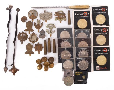 A collection of British regimental cap badges and buttons. Including Gloucestershire, Essex and Hampshire regiments, together with a collection of commemorative coins etc.