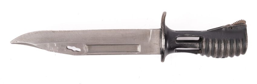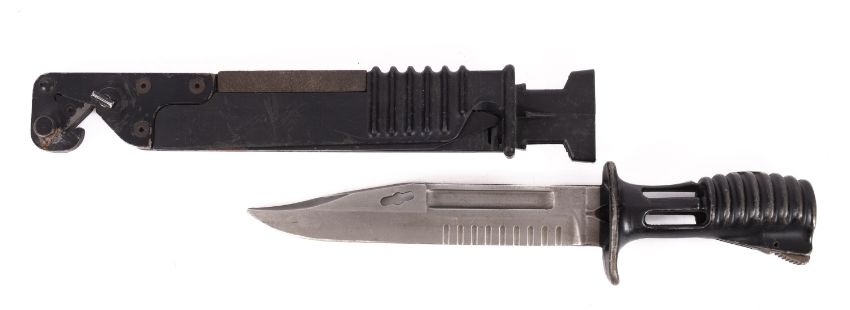 A 1980s British Army SA80 bayonet and scabbard. Having a single edged steel blade to metal handle, the scabbard having a sharpening stone and retractable saw blade. Please Note : Under UK legislation this will not be released without a photo ID and age verification check.