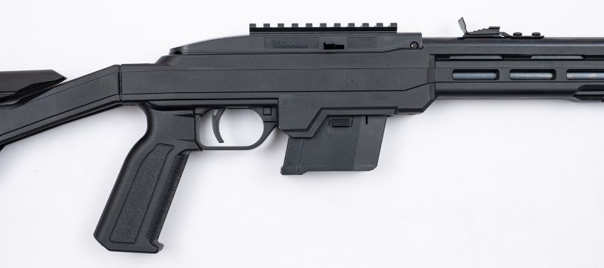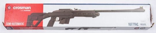 A Crossman Air Power 1077 Tac CO2 powered air rifle. Serial number 723B37454, .177 calibre, having a 17.5' barrel on a composite skeleton stock with 12.5' length of pull, boxed.