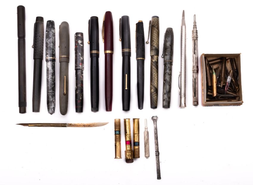 A collection of various fountain pens, including three 14ct nibs plus spare nibs etc.