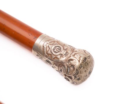 A Devonshire Regiment white metal mounted walking cane. Having the insignia to the top surrounded by scrolling foliate decoration and initials JHB on a wooden shaft, together with a 20th Century Military Policemans Truncheon, having a turned handle and MP stamped to one end, leather strap missing, 40cm long.