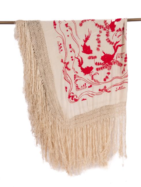 A Victorian embroidered silk shawl. Of square form with floral and fish decoration to an openwork border, 53cm square.