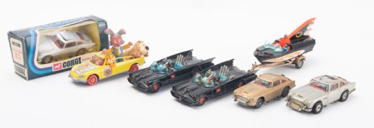 A Corgi diecast James Bond Aston Martin DB5. Number 96655 in original box together with two further unboxed examples as well as two Batmobiles and a Batboat with trailer, plus a Magic Roundabout car all unboxed.