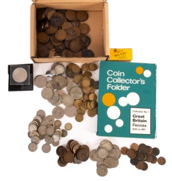 A collection of coins including 1687 Halfcrown, 1855 penny, 1843 Royal Mint coin weight. 2 x 1935 Crowns, 1937 Crown, 1697 Farthing etc.