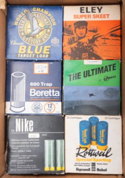 A box of 25 12 gauge Eley Grand Prix cartridges. Together with five other boxes of cartridges in various gauges etc.
