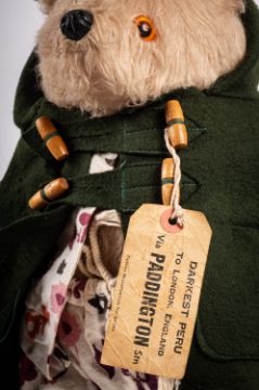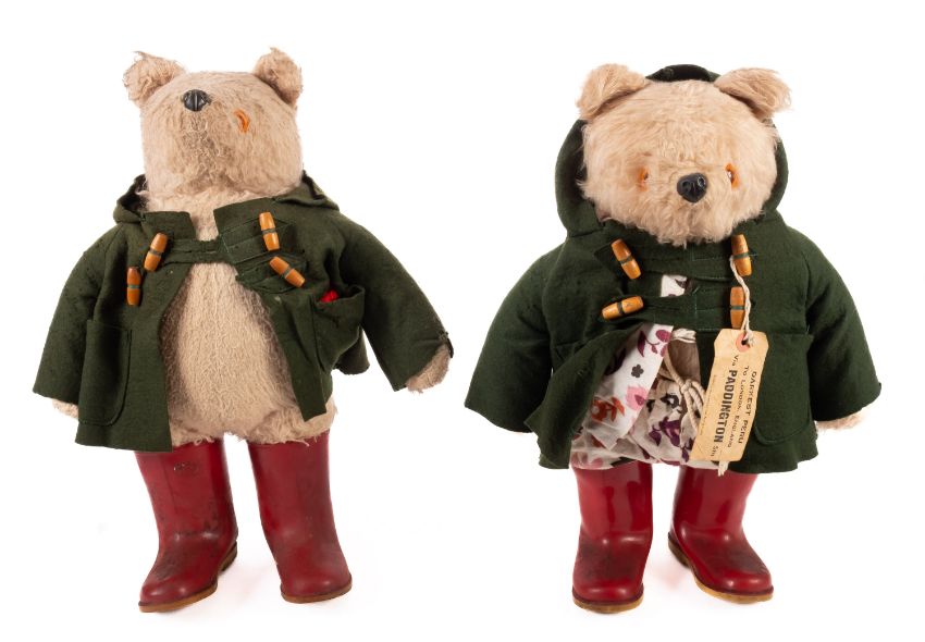 Two 20th Century Paddington Bear soft toys. Having celluloid eyes and wearing green coats with red wellington boots, 50cm high.