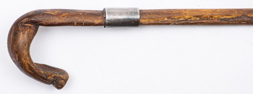 A silver mounted pizzle walking stick, maker Srigg, London. Having a curved handle and silver collar, 68cm long.
