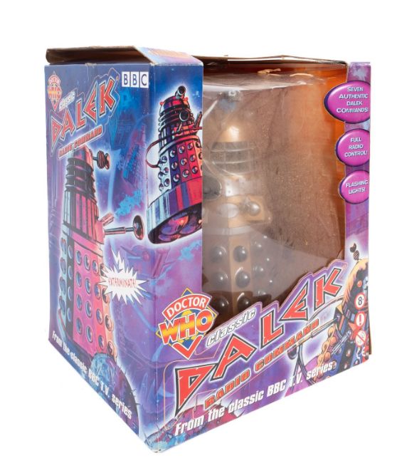 A Product Enterprise Dr Who radio controlled Dalek. In gold with black and silver trim complete with controller and in original box.