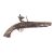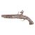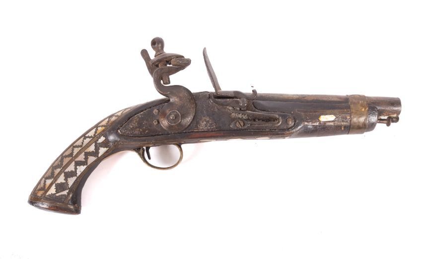 An Indian mother of pearl inlaid flintlock pistol. Having an 8' steel barrel with side lock action on a wooden pistol stock with geometric inlay.