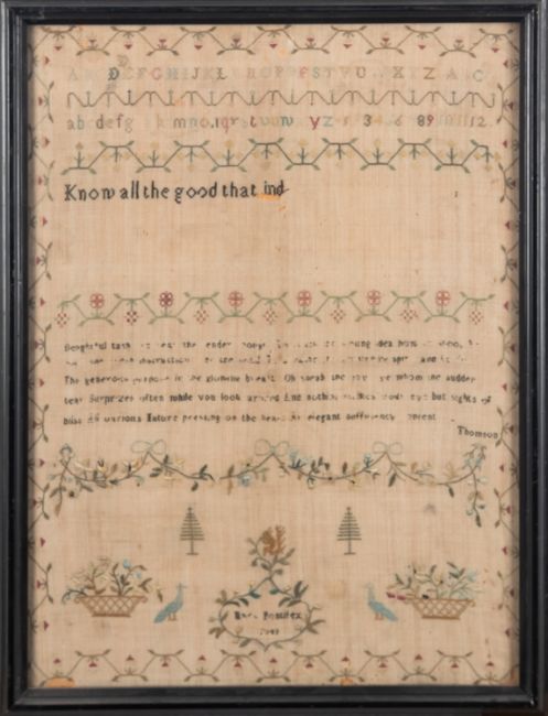 An 18th Century needlework sampler dated 1798. worked by Mary Pontifex, with alphabet and verse within a floral border embellished with birds and foliage, framed and glazed, 40cm high x 29cm wide.