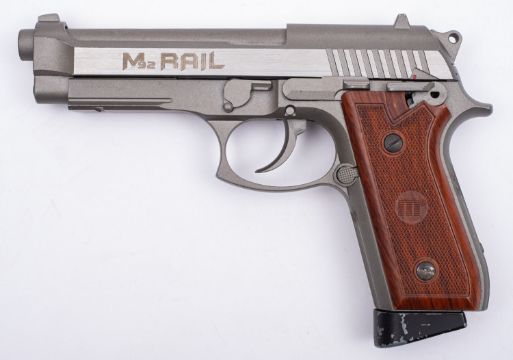 An M Rail 92 air pistol. Serial number 18714920, on a pistol stock with moulded grips.