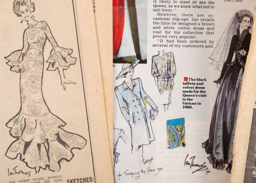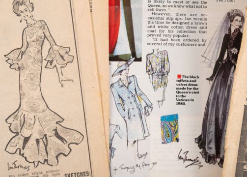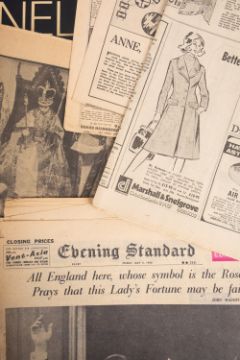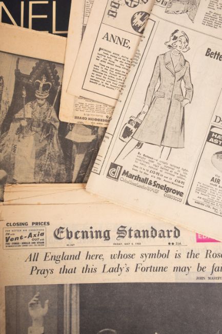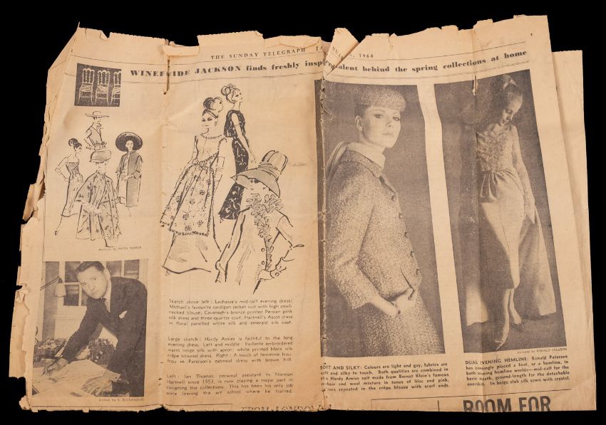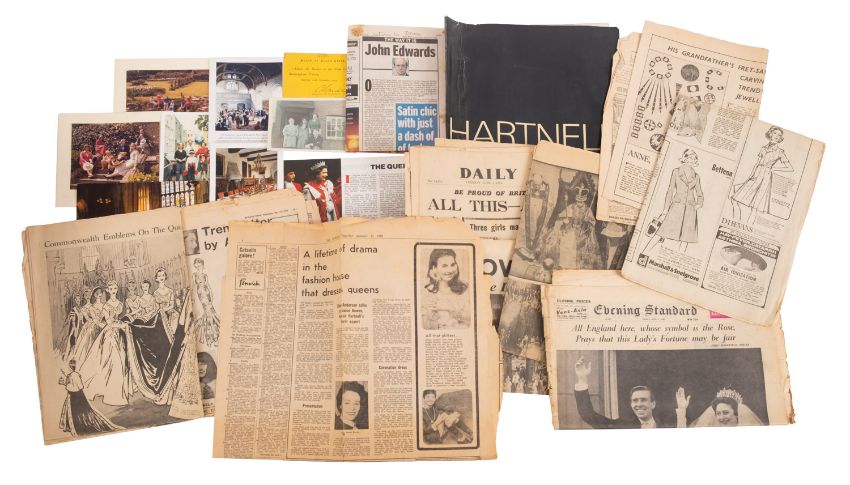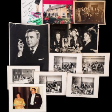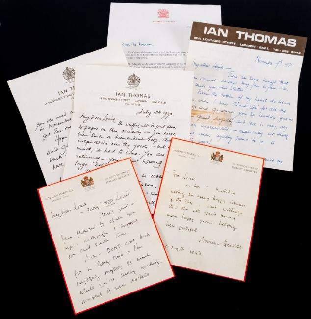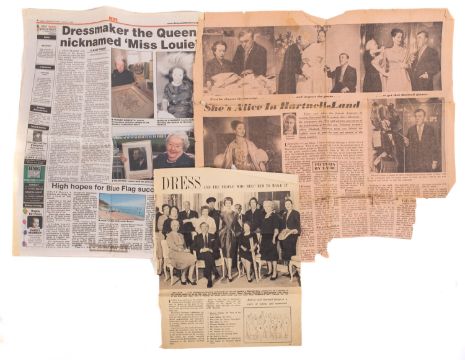 Sir Norman Hartnell, KCVO (9101-1979) British fashion Designer. A collection of ephemera comprising nine Christmas cards designed and hand signed by him, a 9x6.5 black and white photograph frame with inscription 'Time passes-but friendship strengthens', a copy of 'Introducing the House Of Hartnell' and a collection of newspaper cuttings and related ephemera including photographs of Louise Bowen Richardson and house of Hartnell staff. * Note- Norman Hartnell is best known for his work for the ladies of the Royal Family. In 1930 he obtained a Royal Warrant to Queen Elizabeth and in 1957 to Queen Elizabeth II for whom he designed her Coronation dress in 1953. Louise Bowen Richardson worked for Norman Hartnell. Provenance - By direct family descent.