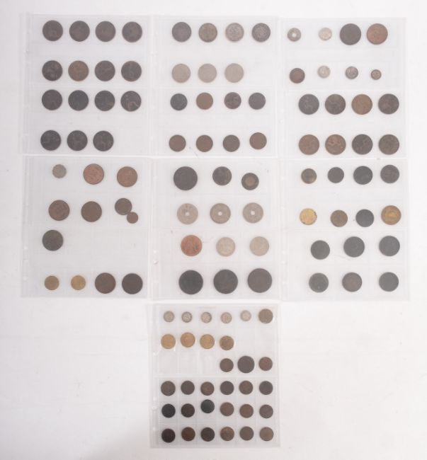 Seven sheets of coins including George III Pennies and Halfpennies, Threepence pub token for "White Horse, Ilminster", West African Pennies, an 1888 Florin, Victorian Pennies, etc.